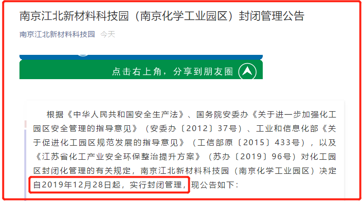 Nach dem Produktionssicherheitsgesetz der Volksrepublik China und der Ann-Charta des Staatsrates "zur weiteren Stärkung des Managements der Sicherheitsrichtlinien für Chemieparks" (Ann so [2012] Nr. 37) hat das Ministerium für Industrie und Informationstechnologie weiter Die Leitlinien zur Förderung der Entwicklung der Spezifikation für chemische Industrieparks "(Ministerium für ehemalige [2015] Nr. 433) sowie die chemische Industrie in der Provinz Jiangsu haben den Umweltsanierungsplan (Sue do [2019] Nr. 96) relevant gemacht Bestimmungen der Verwaltung des chemischen Industrieparks FengBiHua, Nanjing Jiangbei neuer Materialwissenschaft und Technologiepark (Nanjing Chemical Industrial Park) Entscheidung seit dem 28. Dezember 2019, die geschlossene Verwaltung, Die Bekanntmachung lautet wie folgt: